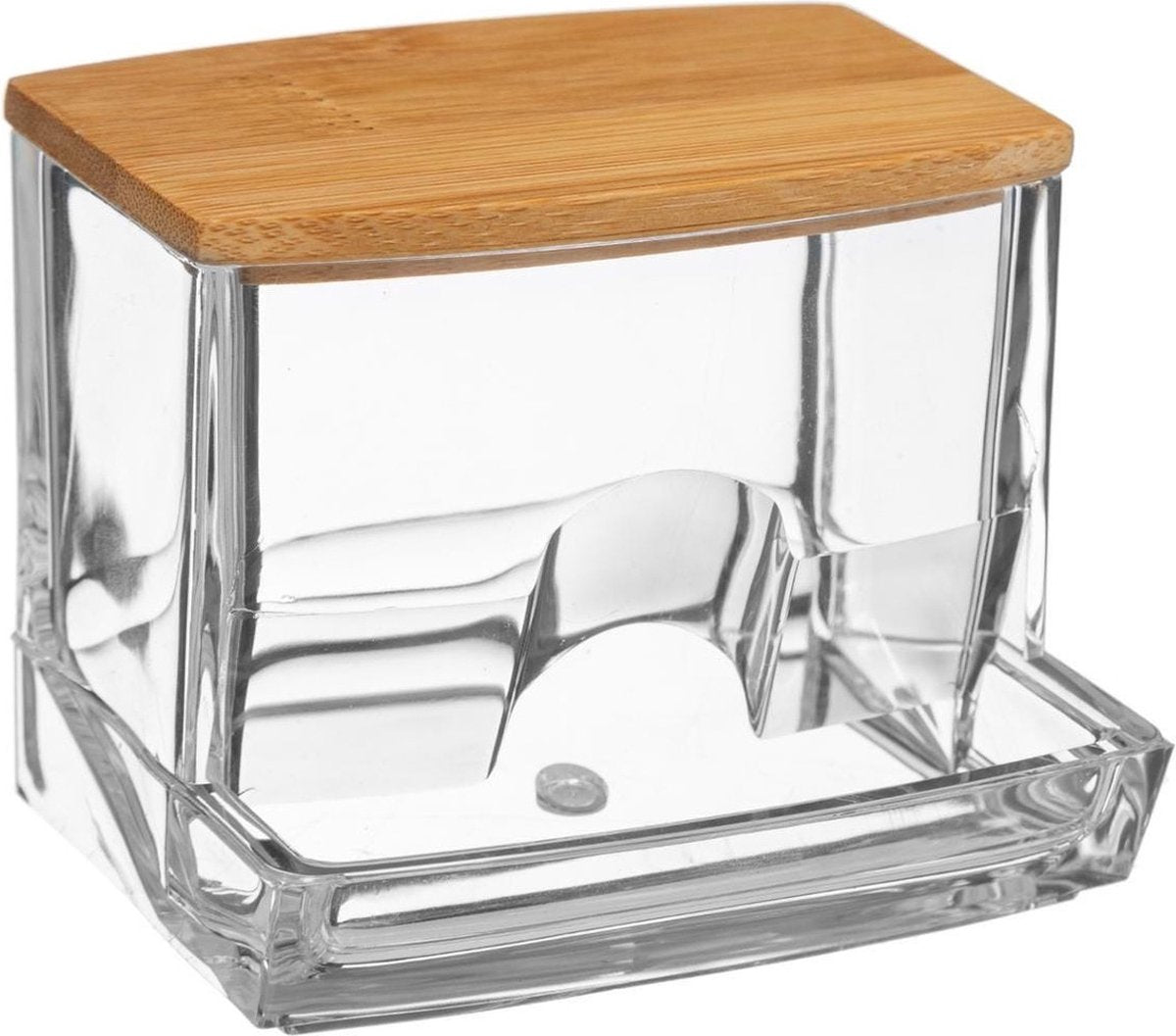 De wattenstaafjes houder van Five® is een stijlvolle oplossing voor de standaard verpakking van jouw wattenstaafjes. Het ontwerp met bamboe deksel misstaat zeker niet op de wastafel. De opening onderin maakt het gemakkelijk om te wattenstaafjes te pakken. Het bakje voor wattenstaafjes is 9,5 cm breed, 8 cm diep en 7,5 cm hoog. De wattenstaafjes houder is gemaakt van kwalitatief sterk kunststof en heeft een bamboe deksel. De bamboe deksel is gemakkelijk te openen om wattenstaafjes bij te vullen. De opening onderin geeft de mogelijkheid om een wattenstaafje te pakken zonder de deksel eraf te hoeven halen. Overzichtelijk opbergen van badkamer producten. Net zoals andere badkamer producten komen wattenstaafjes vaak in een onhandige, niet fraaie verpakking. Het wattenstaafjes bakje heeft een moderne uitstraling en staat hierdoor mooi in jouw badkamer. Door het transparante bakje zie je snel wanneer het tijd is om bij te vullen. De bamboe wattenstaafjes houder combineer je met de de wattenschijfjeshouder
