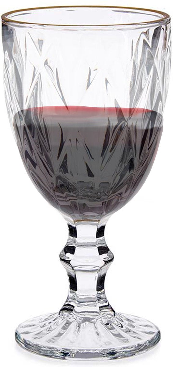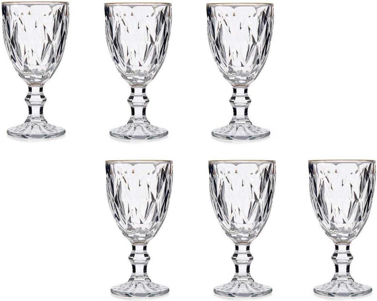 Een set met 6x stuks luxe glazen op voet met een inhoud van 254 ml. Deze mooie glazen hebben een gouden rand en hebben een kristal geslepen look.