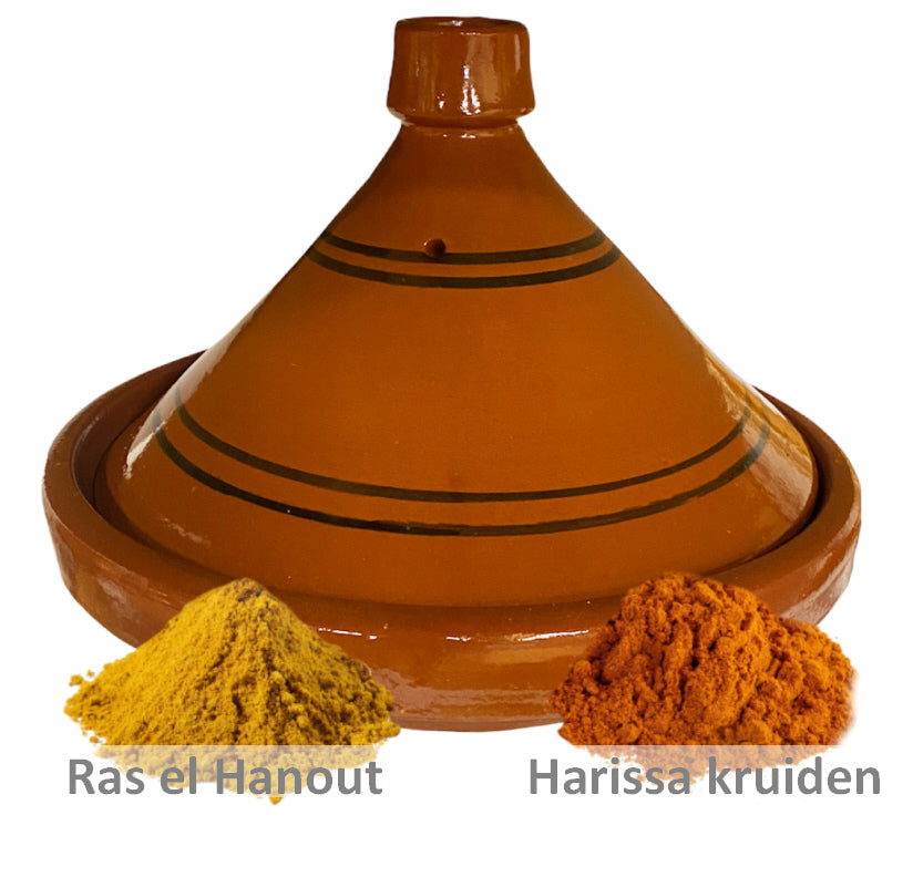 Aardewerk tajine 30 cm met Ras el hanout en Harissa kruiden