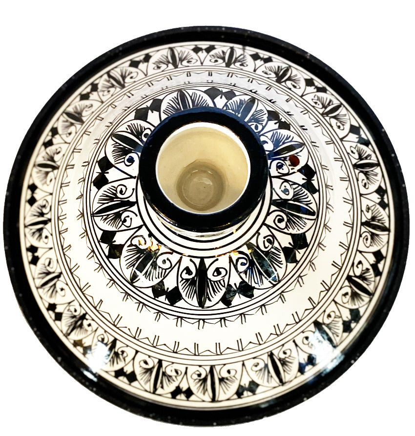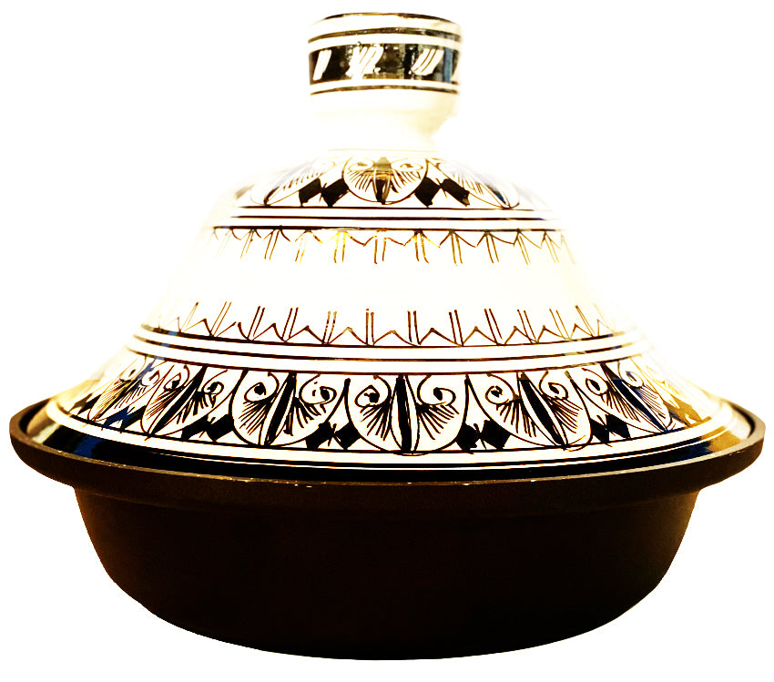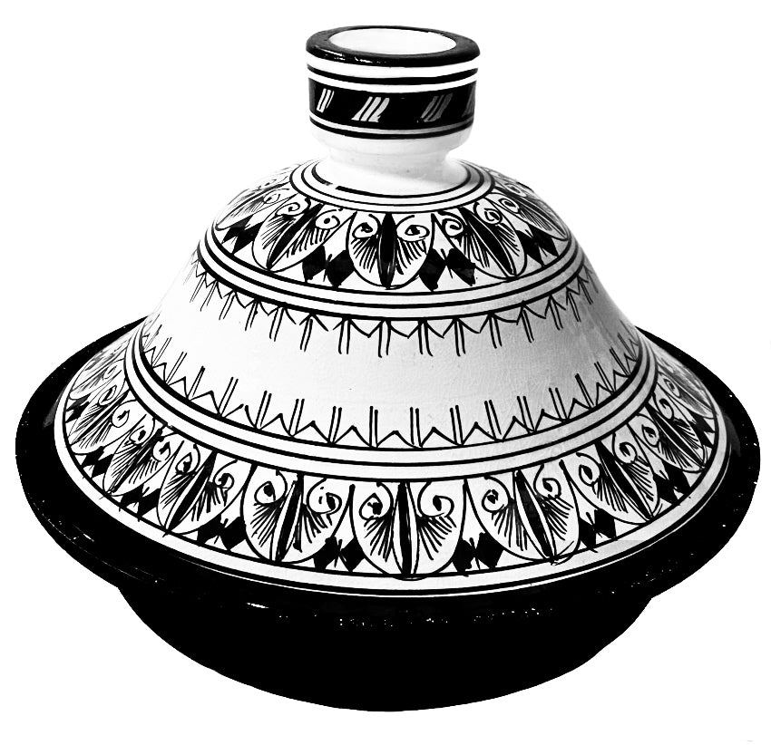 Een stijlvolle tajine (Stoofpan ) in zwart wit geschikt voor alle kookplaten, inclusief inductie.