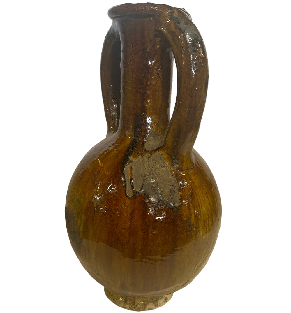 Handgemaakte grote Tamegroute Vaas - kruik met handvaten in de kleur okergeel, heeft een hoogte van circa 50 cm. Een decoratieve pronkstuk voor uw huis.
