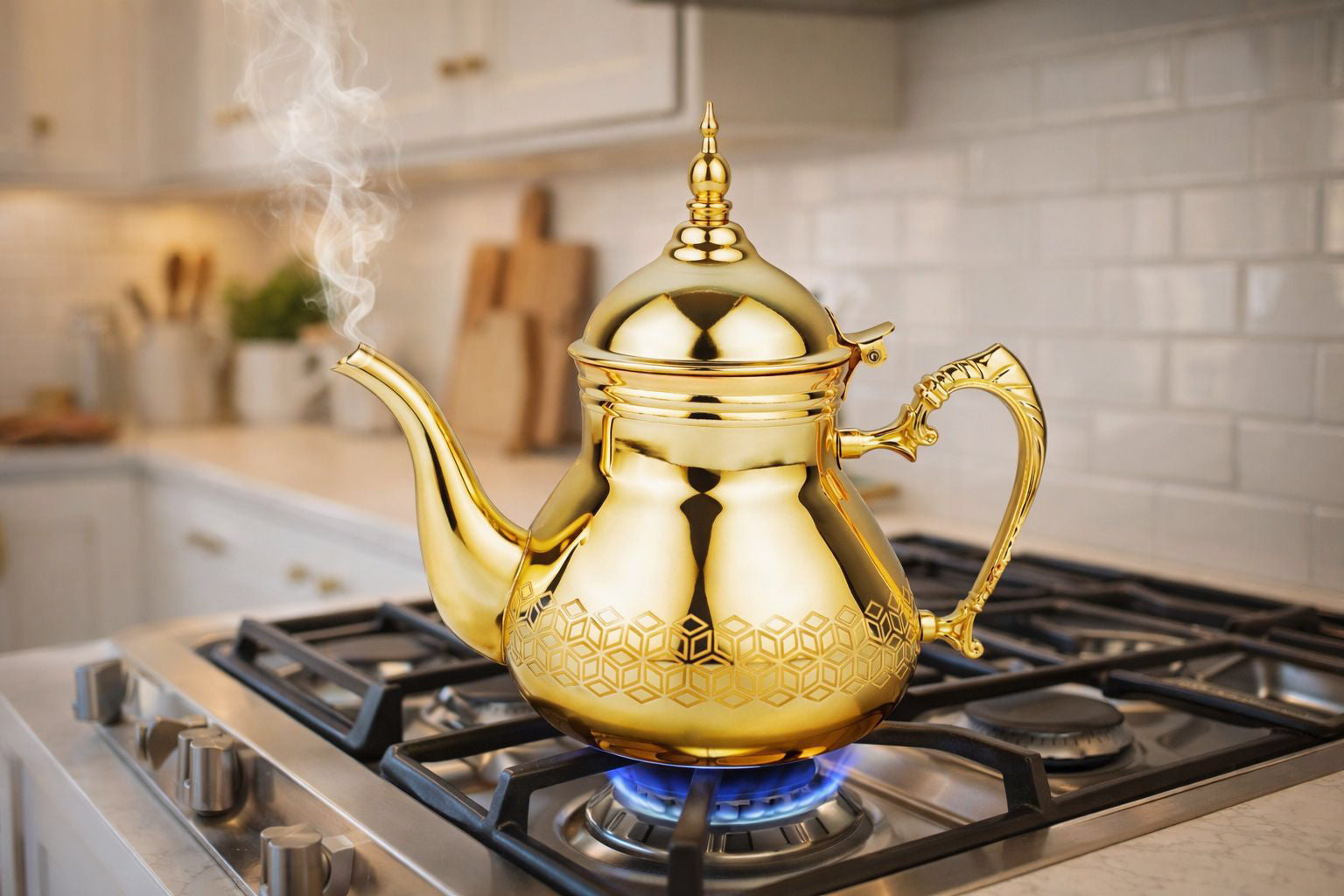 De HAKAL Sultana gouden theepot brengt luxe en traditie samen in één elegant ontwerp. Deze Marokkaanse theepot is vervaardigd uit hoogwaardig roestvrij staal en afgewerkt met een stijlvolle goudkleurige coating. De verfijnde geometrische details en het klassieke Arabische silhouet maken deze theepot tot een echte eyecatcher.
