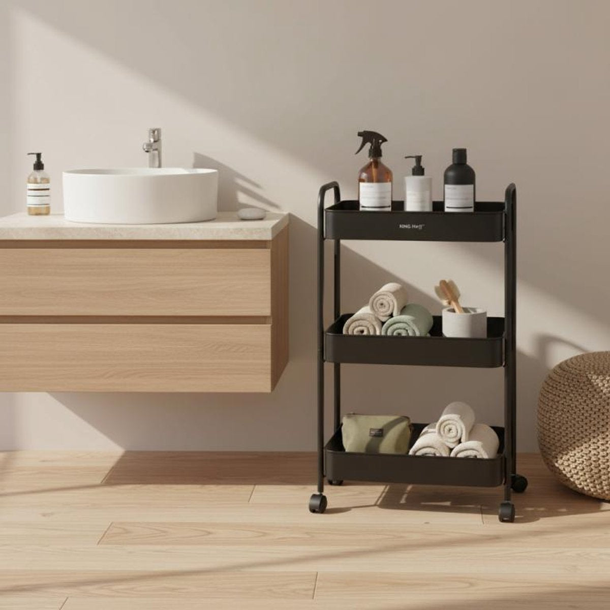 Deze drielaagse opbergkar van Kinghoff is uw betrouwbare partner voor de dagelijkse organisatie. Gemaakt van poedergecoat staal, combineert hij een elegante uitstraling met een uitzonderlijke duurzaamheid. De matzwarte afwerking past in elk interieur.
