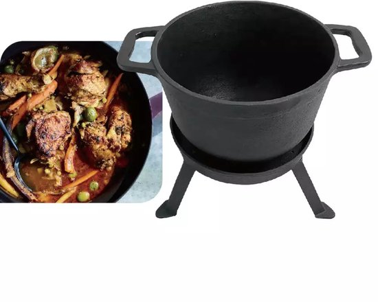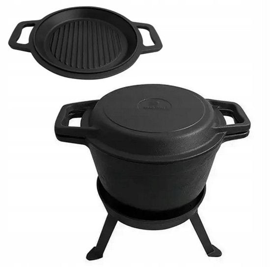 3-in-1 functionaliteit: Inclusief gietijzeren pan, grilldeksel (te gebruiken als grillpan) en onderstel met poten voor stabiel gebruik boven vuur of kolen.