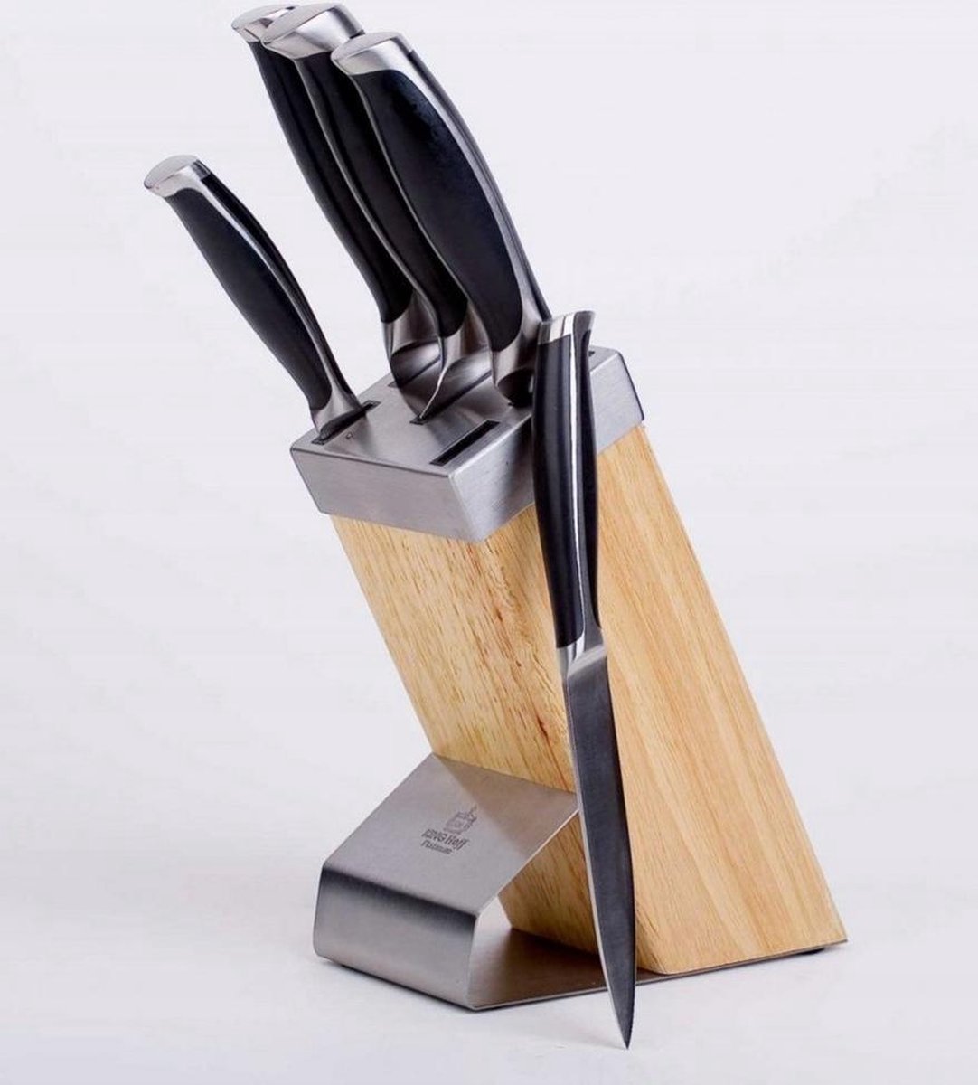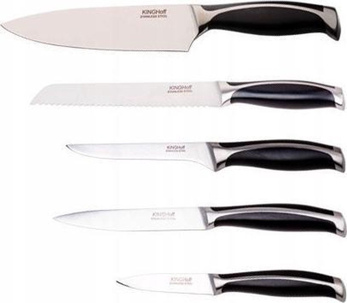 Een 6-delige messenset in een KINGHOFF-blok. Ontworpen voor het portioneren van vlees en vis, het snijden van brood en het schillen en hakken van groenten. Messen gemaakt van hoogwaardig roestvrij staal Ferrinox 18/10 met hoog koolstofgehalte 1.4028 / X30Cr13. Een belangrijk kenmerk van dit staal is het feit dat het bestand is tegen alle soorten krassen, krassen en wordt gekenmerkt door een verhoogde weerstand tegen slijtage en corrosie. Het lemmet is gemaakt van chroom-molybdeenstaal, extreem hard, bestand tegen vervorming, vatbaar voor slijpen. Het mes is volgens traditionele kunst gemaakt uit één stuk staal. De handgrepen zijn ergonomisch, gevuld met bakelietmassa en zorgen ervoor dat je hem stevig vast kunt houden zonder weg te glijden.