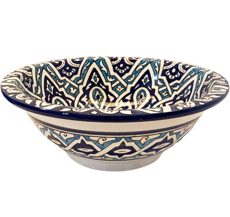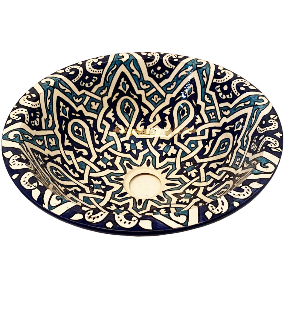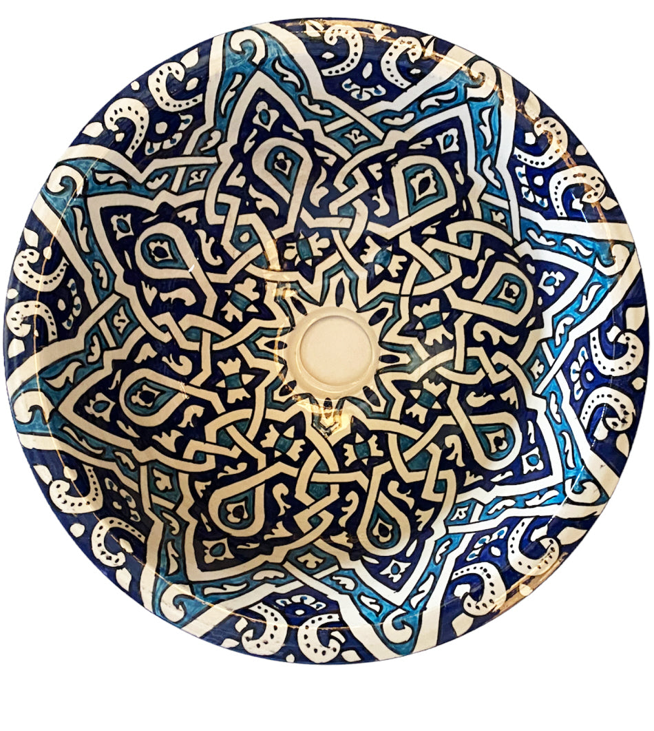 Op traditionele wijze gevormde Marokkaanse waskom is met de hand gemaakt en geschilderd. De felgekleurde accenten maken deze unieke waskom een ware eye-catcher. De Marokkaanse waskom kunt u plaatsen op elk gewenst oppervlak. Denk bijvoorbeeld aan een robuuste houten plank of een topblad. Deze opzetwastafel kunt u helemaal aanpassen aan uw eigen wensen.