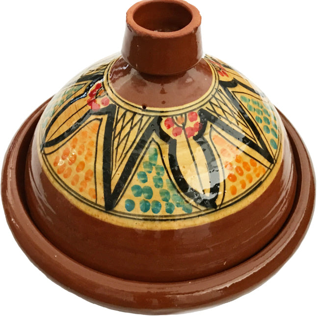 Marokkaanse tajine handgemaakt en van aardewerk. Door de speciale kegelvormige deksel loopt het verdampte vocht weer terug op de ingrediënten, omdat bij bereiding van gerechten in de tajine niet alleen alle sappen, maar ook alle geuren bewaard blijven, is het een ware geursensatie om de tajine op tafel in het bijzijn van alle eters te openen! Formaat: Ø 35 cm. – Hoogte: 22 cm. Let op: De tajine wordt handgemaakt en beschilderd, het kan voorkomen dat de beschildering op het geleverd model iets afwijkt van die op de foto. Het kan ook wel eens voorkomen dat de tajine een onvolkomenheid vertoont (denk aan een verkeerde verfspatje, kleine oneffenheden). Enerzijds is dit de charme van het product. - Alle kooktajines zijn loodvrij! - Bij gesloten vindt u altijd gebruiksaanwijzing bij uw tajine. Onderhoud Was de tajine met de hand af met een beetje afwasmiddel en warm water. Gebruik een niet-metalen borstel en laat het aardewerk niet in water staan. Laat de tajine goed drogen om schimmel te voorkomen. Welke warmtebronnen zijn geschikt? U kunt de tajine op iedere warmtebron gebruiken behalve inductie. Welke gerechten kunt u bereiden? Gebruik de tajine voor het bereiden van vis, vlees, groenten en fruit. De smaak van toegevoegde kruiden en andere smaakmakers krijgen tijdens de bereiding in de tajine goed de tijd om goed op elkaar in te werken. Het resultaat is een smakelijk en vetarm gerecht. Marocstore heeft een uitgebreide assortiment aan tajines (tagines) van aardewerk. Alle onze tajines halen wij zelf uit Marokko en zijn loodvrij.