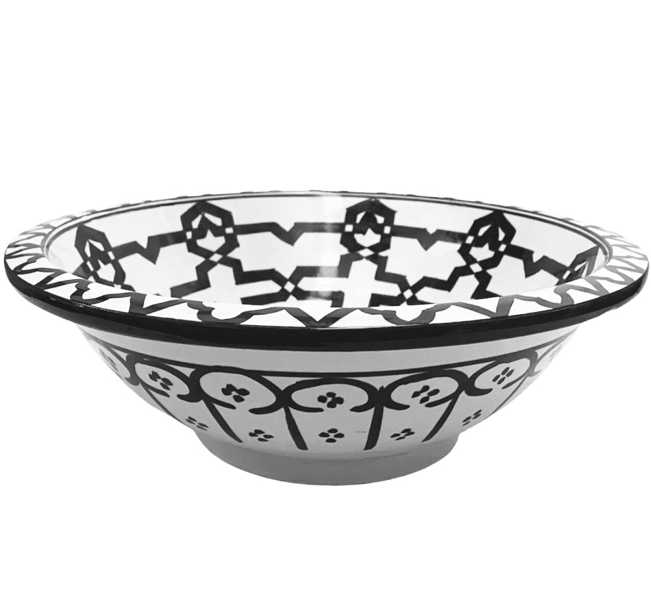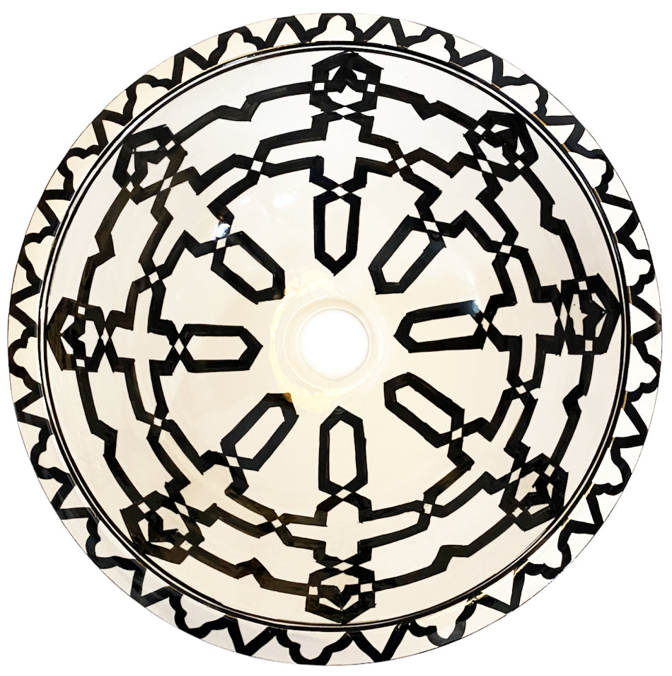 Handgemaakte Marokkaanse opzet keramiek wasbak in zwart wit, geschilderd en op een traditionele wijze gevormd. Onze waskommen worden gemaakt in... Lees meer