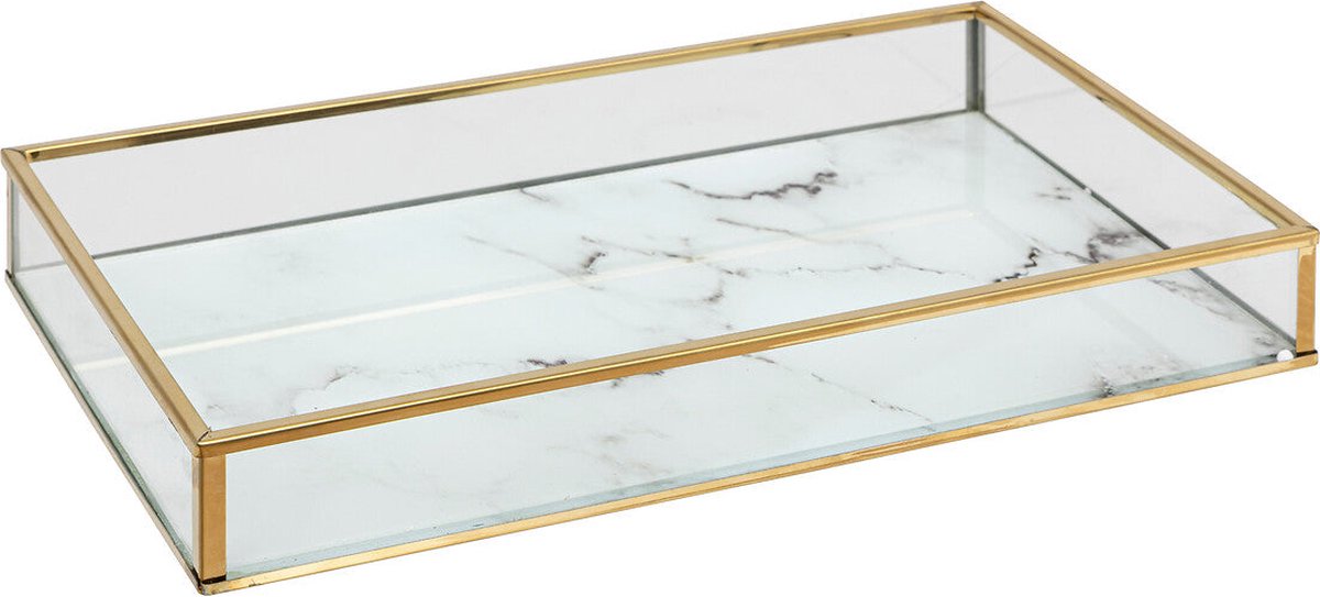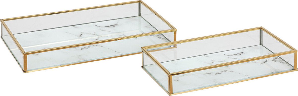 De set hokjes Rosio bestaat uit twee rechthoekige elementen van verguld metaal en glas, met gemarmerde bodems. In verschillende maten staan ze geweldig op een console of ladekast om je persoonlijke bezittingen in op te bergen, en kunnen ze ook op zichzelf staan als designobjecten!