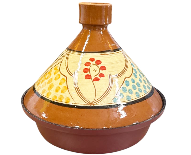 Wat deze tajine uniek maakt is het handgeschilderde deksel met warme kleuren en abstracte patronen in geel, turquoise, zwart en rood. Elk motief is met zorg aangebracht en maakt van iedere tajine een uniek kunstwerk. De onderzijde is uitgevoerd in een diepe donkerrode kleur en afgewerkt met een duurzame coating.