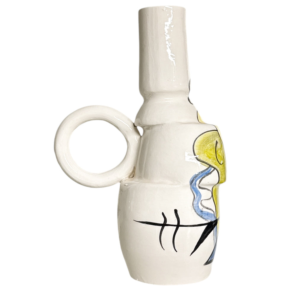 Deze prachtige, handgemaakte vaas is een uniek meesterwerk van een Marokkaanse kunstenaar, met slechts één exemplaar beschikbaar. De vaas is gedecoreerd met levendige en expressieve kleuren zoals rood, geel, blauw en oranje, waardoor het een ware blikvanger is in elk interieur. Het abstracte ontwerp is zorgvuldig op het keramiek aangebracht en geeft de vaas een moderne uitstraling die zowel in traditionele als eigentijdse omgevingen past.