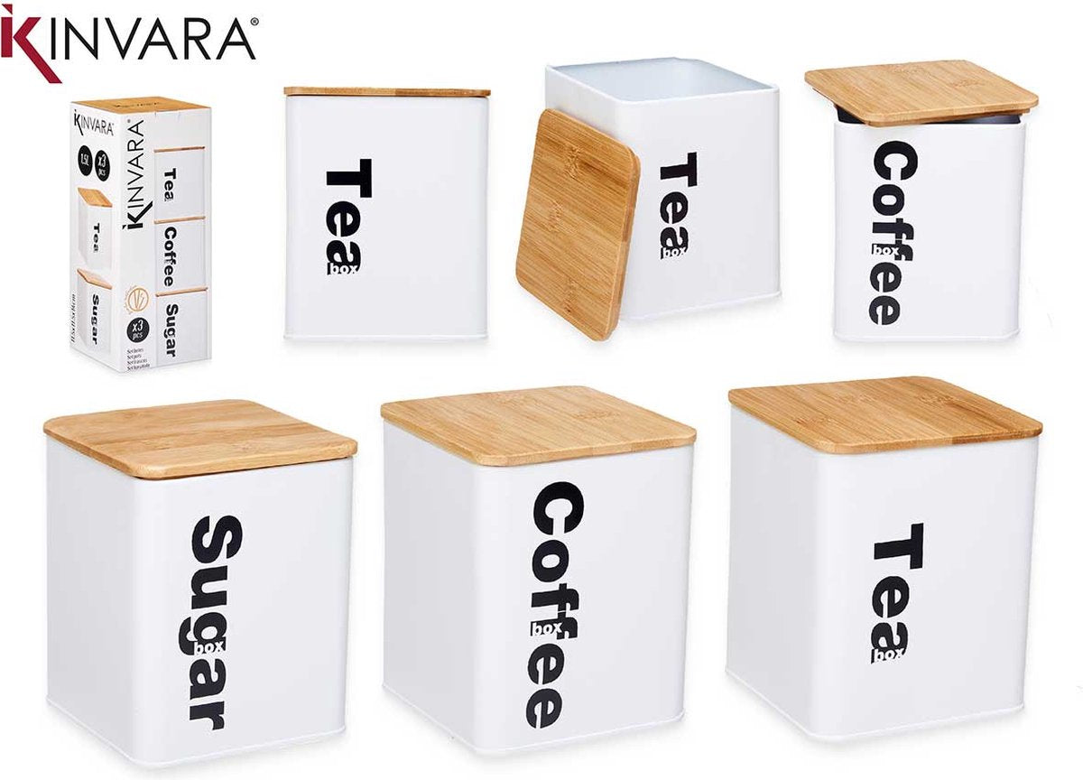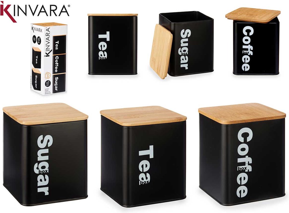 Set van 3 authentieke voorraadbussen voor koffie, thee en suiker. Een leuke blikvanger in jouw keuken, en nog eens zeer nuttig ook! Sommige producten bewaar je beter op een donkere plek. Vandaar deze mooie zwarte voorraadblikken met een bamboe deksel.